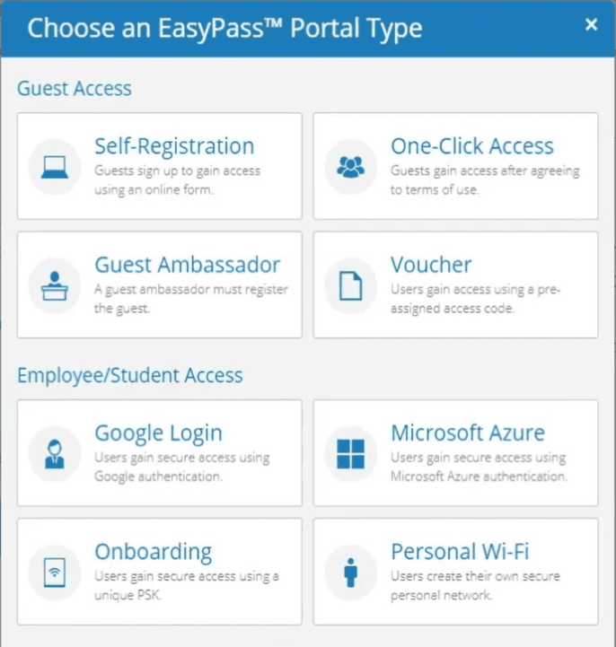 EasyPass has eight different types of access portals. Employees with minimal technical knowledge can easily and securely connect personal devices to the corporate network using Microsoft, Google or simple IT-issued credentials.