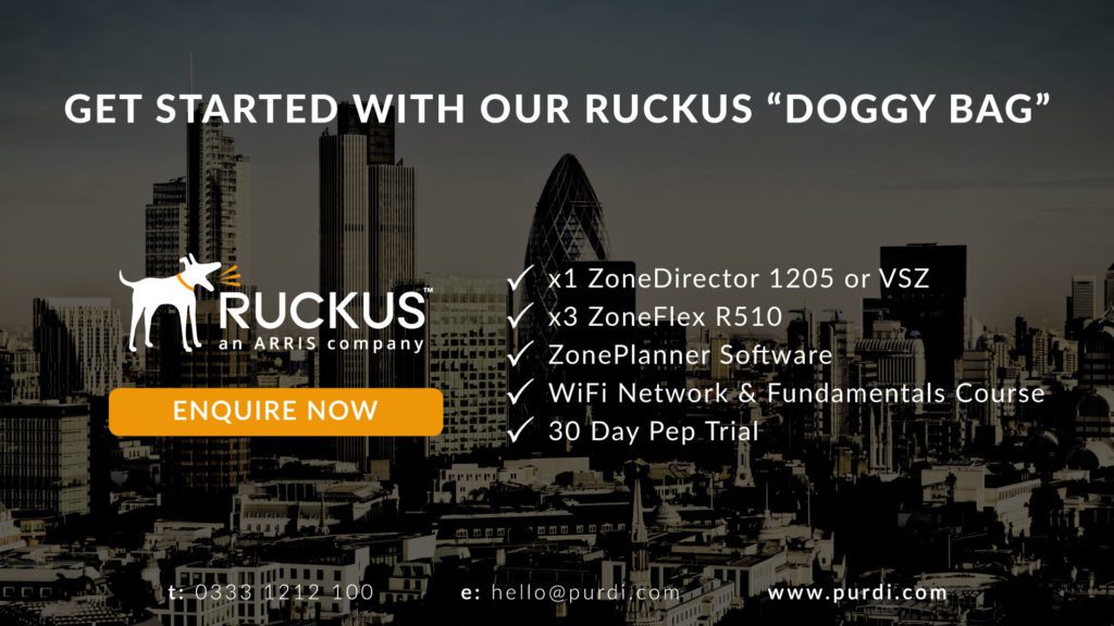 Purdicom is introducing the ‘Doggy Bag’, a perfect starter kit to get you up and running with Ruckus Networks. The kit includes x1 ZoneDirector or VSZ, x3 ZoneFlex R510, ZonePlanner software, WiFi Network & Fundamentals Training course and a free Pep trial at an unbelievable price!