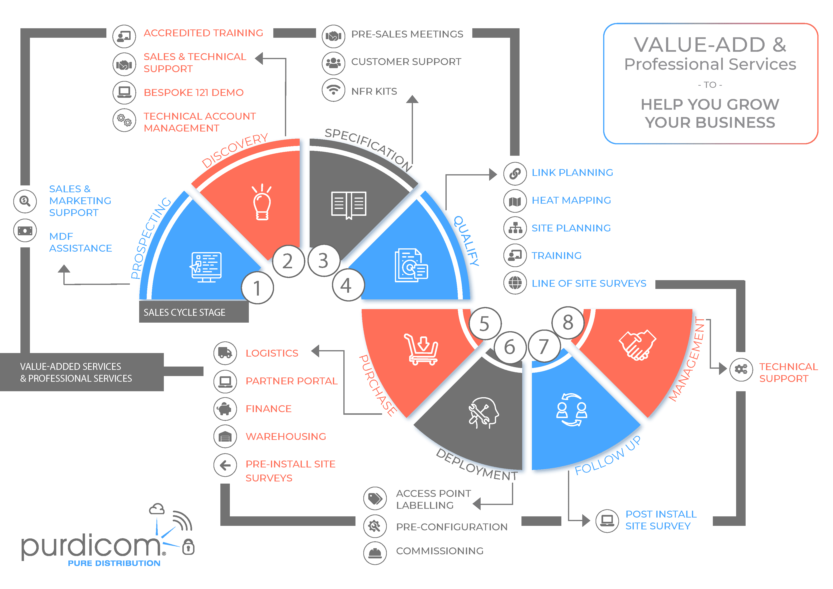 Download our value-add & professional services flyer for an overview of each of our services. Most of our value-add comes to you at no cost, however, some professional services are subject to price on application – check out the rate-card for the standard site visits, although bear in mind that every service can be customed to your own requirements. You can also download a copy of the infographic below. Email us today to find out more at sales@purdi.com